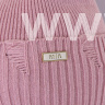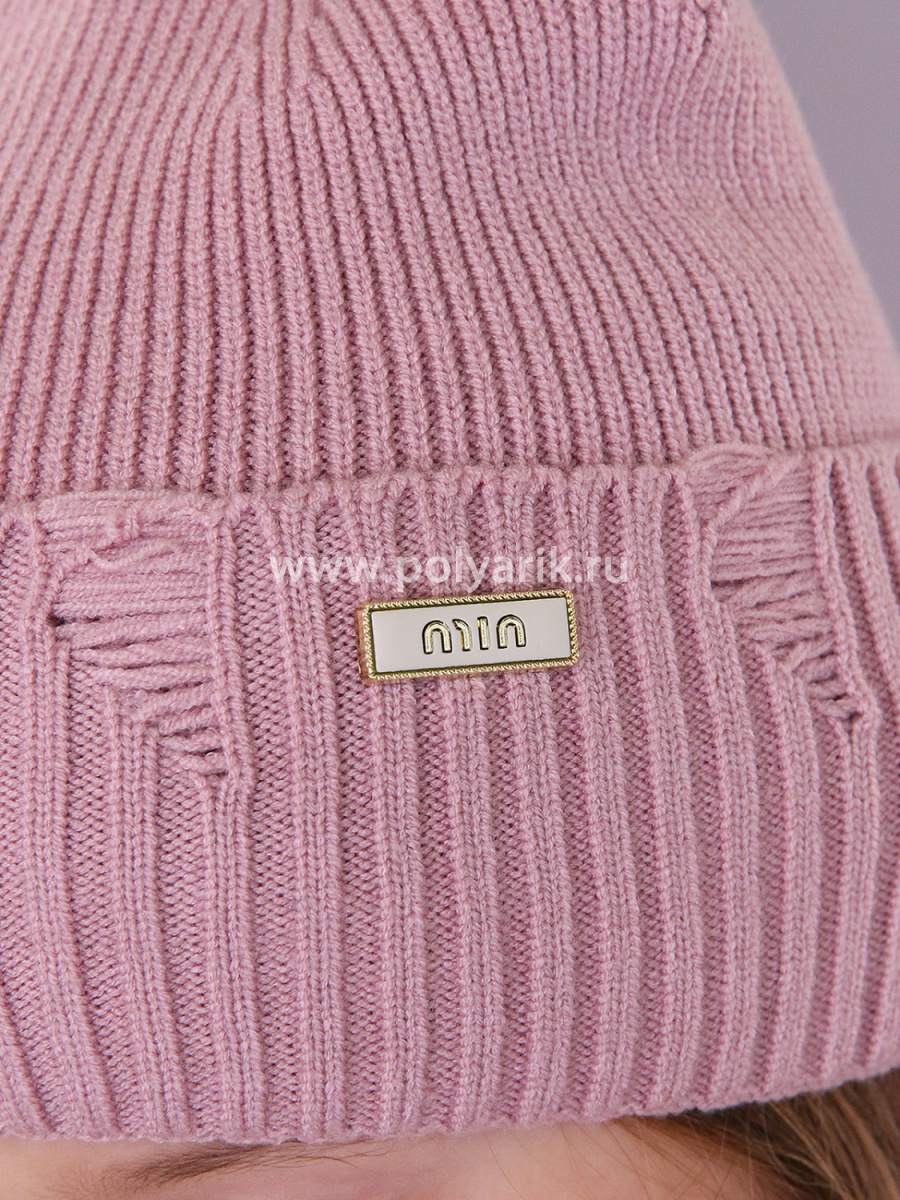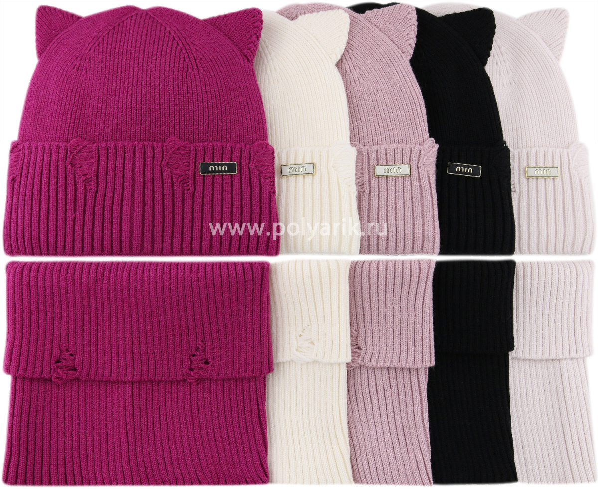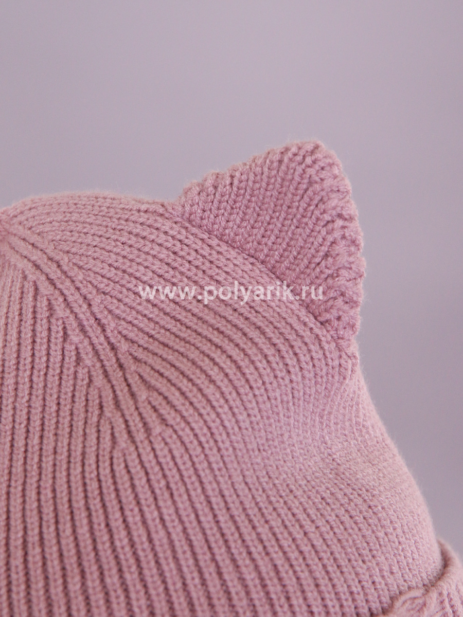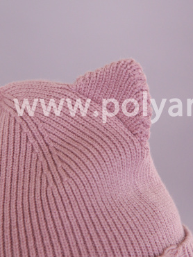 Шапочка украшена декоративными ушками и рваной вязкой, создающими милый и игривый акцент, а также стильной металлической пластиной с надписью