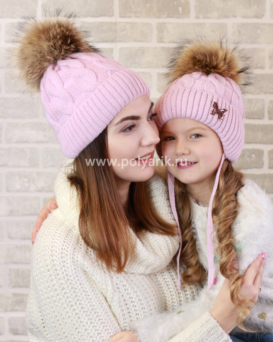 Комплект из двух шапок - Мама и Дочка, шапочка для Дочки с х/б подкладом и утеплителем синтепон, шапочка для Мамы подшита флисом, теплые, мягкие, красивые, хорошо тянутся. Натуральный енотовый помпон.