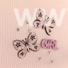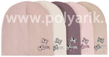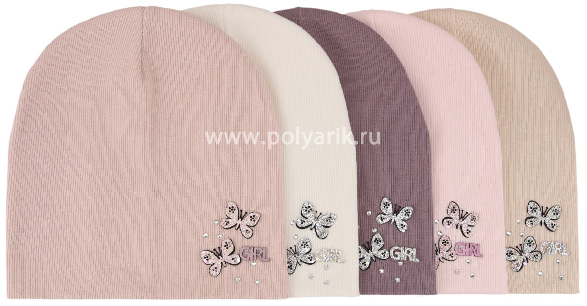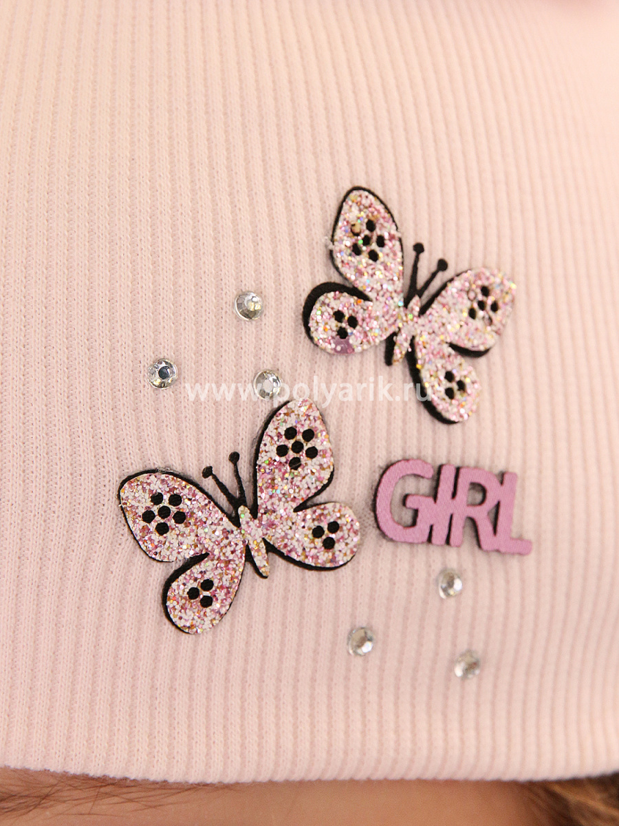 шапка украшена яркими и блестящими нашивочками в виде бабочек, россыпью страз